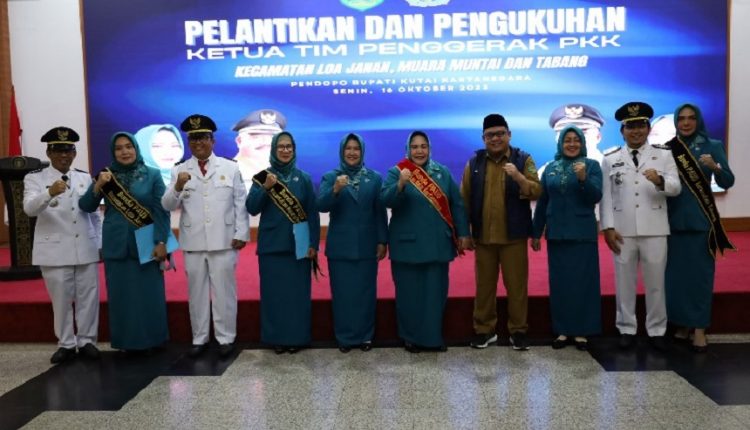 TENGGARONG:Ketua Tim Penggerak Pemberdayaan Kesejahteraan Keluarga (TP KK) dan Bunda Pendidikan Anak Usia Dini (PAUD) Kutai Kartanegara (Kukar) Maslianawati Edi Damansyah, melantik dan mengukuhkan Ketua TP PKK dan Bunda PAUD Kecamatan Loa Janan, Muara Muntai dan Kecamatan Tabang, Senin (16/10/2023) di Pendopo Odah Etam Tenggarong.