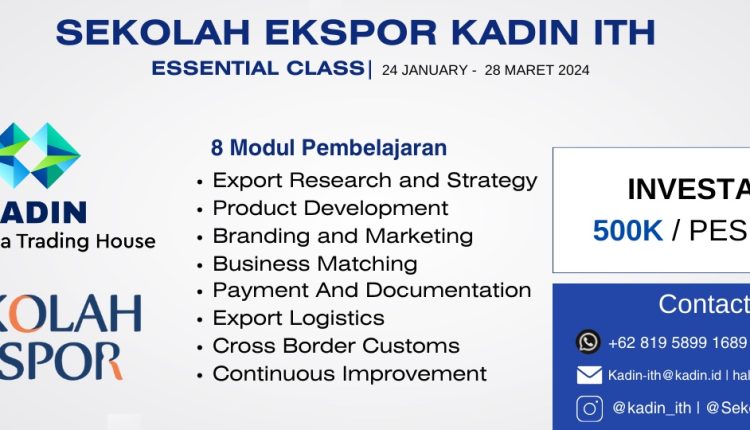PT Kamar Dagang Indonesia atau yang lebih dikenal dengan Kadin Indonesia Trading House (Kadin ITH) bersama Sekolah Ekspor di bawah naungan Handito Joewono meluncurkan kelas perdana “Export Essential Class” dengan metode Pembelajaran Online Asinkron. Kelas ini membekali peserta dengan pengetahuan yang penting dan mendasar tentang ekspor dengan 8 Modul Pembelajaran: Export Research and Strategy, Product Development, Branding and Marketing, Business Matching, Payment and Documentation, Export Logistic, Cross Border Customs, dan juga Continuous Improvement.