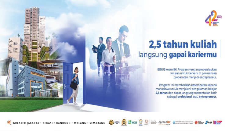 BINUS UNIVERSITY menawarkan sistem pembelajaran holistik yang memungkinkan mahasiswa mengembangkan keterampilan adaptif dan berdampak positif pada masyarakat dalam waktu 2,5 tahun untuk bisa langsung menggapai karir, dengan berbagai program penguatan seperti magang, kewirausahaan, penelitian, dan studi di luar negeri. Ini mencerminkan komitmen universitas untuk menghasilkan lulusan yang siap bersaing dan berinovasi dalam dunia kerja yang terus berkembang serta menjadi agen perubahan positif.