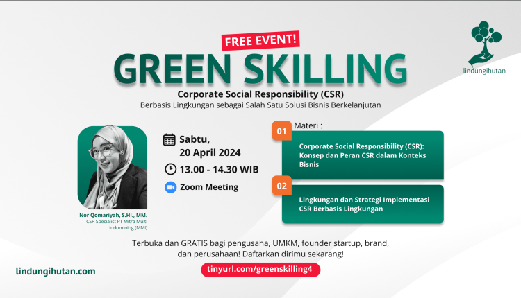 LindungiHutan hadirkan kembali webinar gratis Green Skilling dengan topik bahasan “Corporate Social Responsibility (CSR) Berbasis Lingkungan sebagai Salah Satu Solusi Bisnis Berkelanjutan” pada Sabtu, 20 April 2024.