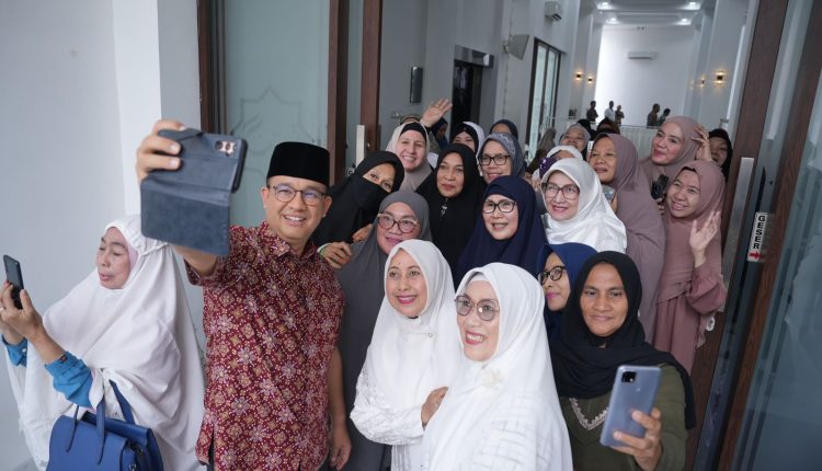 Anies datang bersama juru bicaranya, Sahrin Hamid. Kedatangan Anies disambut meriah ibu ibu yang sudah menunggu sebelum waktu sholat dzuhur tiba.