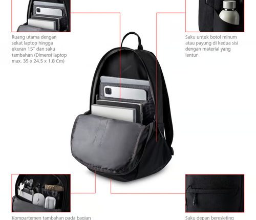 Dengan berbagai fitur unggulan seperti ruang utama dengan sleeve laptop, kantong depan yang luas, sleeve botol air elastis, dan desain minimalis yang ergonomis, tas ini menawarkan kenyamanan dan fleksibilitas maksimal.