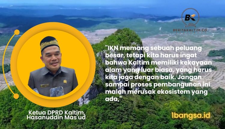 Samarinda,1bangsa.id – Ketua Dewan Perwakilan Rakyat Daerah (DPRD) Kalimantan Timur, Hasanuddin Mas’ud, mengungkapkan keprihatinannya terkait dampak pembangunan Ibu Kota Nusantara (IKN) terhadap ekosistem dan kekayaan alam di Kaltim. Meskipun proyek ini membawa peluang besar untuk mendorong pertumbuhan ekonomi dan infrastruktur, ia menegaskan pentingnya menjaga keseimbangan antara pembangunan dan pelestarian lingkungan.