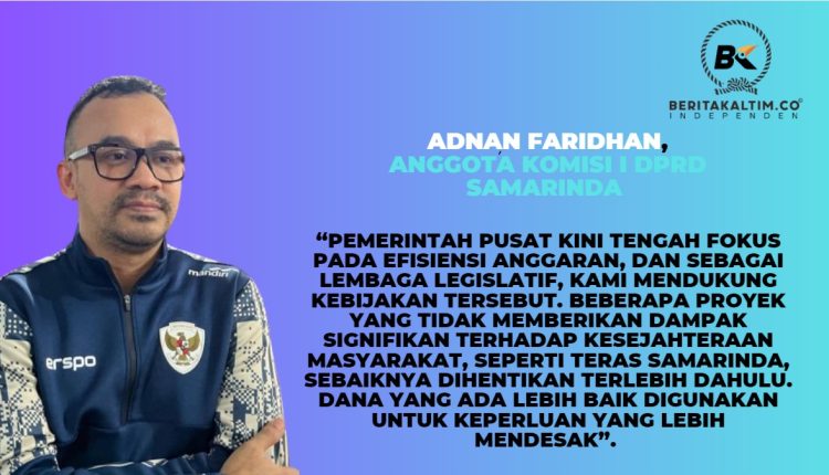Anggota Komisi I DPRD Kota Samarinda, Adnan Faridhan, mengungkapkan bahwa beberapa proyek yang sedang berjalan, termasuk pembangunan Teras Samarinda, sebaiknya dihentikan karena tidak memberikan manfaat langsung bagi masyarakat. Ia menyarankan agar dana tersebut dialokasikan untuk sektor yang lebih penting, seperti pendidikan, kesehatan, dan infrastruktur dasar.